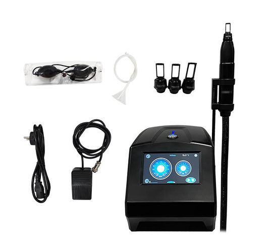 Laser tattoo removal machine using the high energy emitted by the laser instantaneously, the irradiated pigment particles absorb the energy and rupture instantly. Part of which turns into even smaller fragments and is excreted out of the body. And part of which is engulfed by human macrophages and excreted through the lymphatic system, thus getting rid of the pigment.